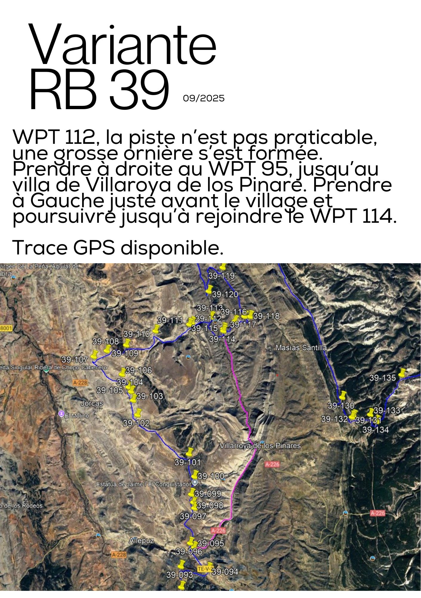 -Après le WPT 227, au kilomètre 1,66, prendre la seconde piste sur votre gauche. ( Voir photo ) -WPT 112, la piste n’est pas praticable, une grosse ornière s’est formée. Prendre à droite au WPT 95, jusqu’au villa de Villaroya de los Pinare. Prendre à Gauche juste avant le village et poursuivre jusqu’à rejoindre le WPT 114. Envoyez nous un mail pour obtenir la trace de la variante.