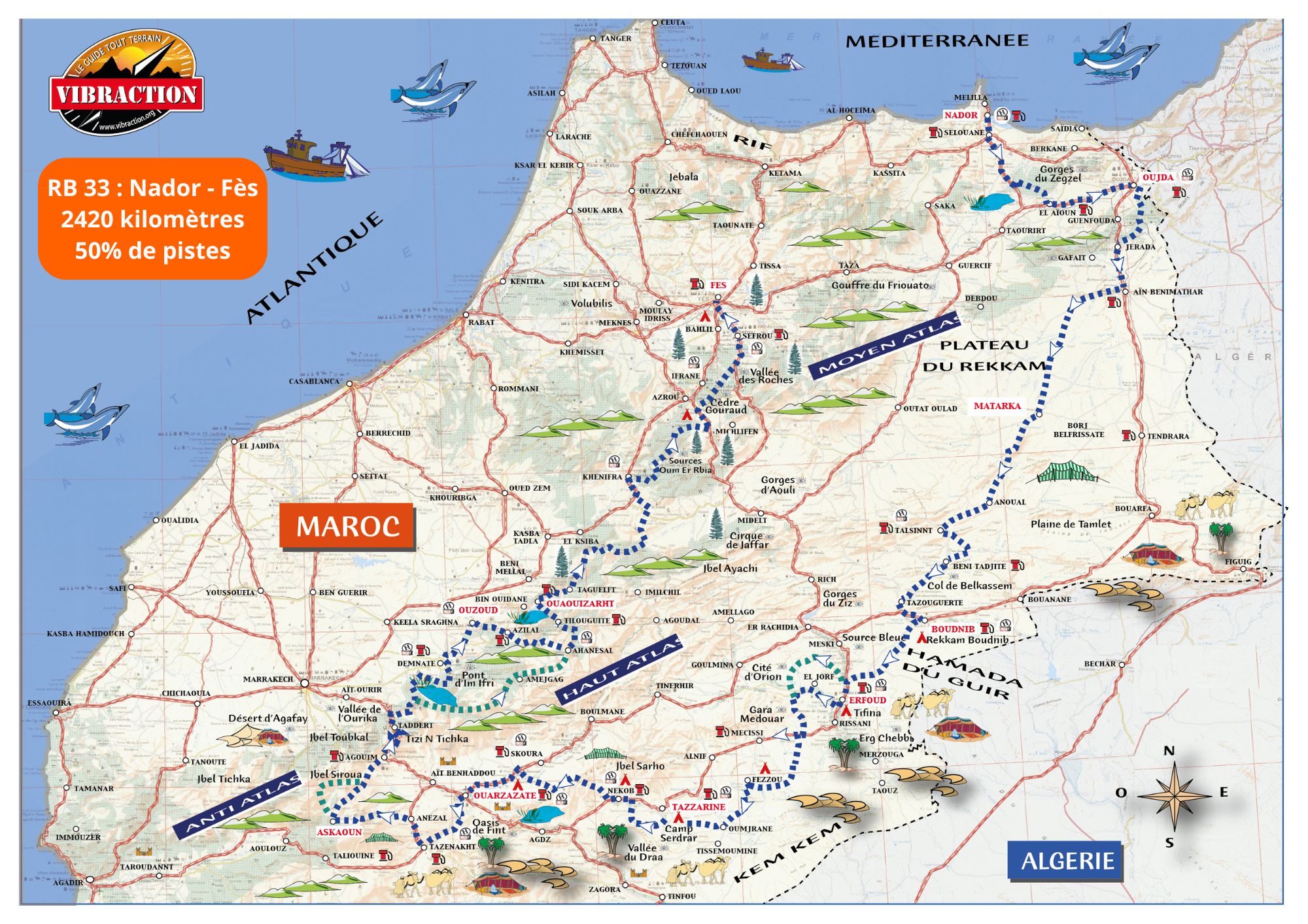 A la frontière de l'Europe, plein Sud, 14 kilomètres de Méditerranée nous relient au Maroc, pays attrayant, riche de tous les contrastes tant par ses paysages que par sa civilisation. Ce road book fait 2430 km au total avec environ 1100 km de pistes. Ce détail comprend les deux étapes de liaisons. La première pour rejoindre Oujda où démarrent les pistes. La dernière qui permet de remonter à Fès mais comporte très peu de pistes.